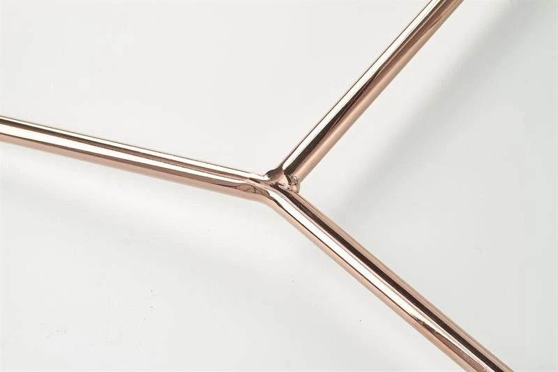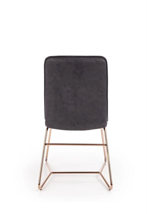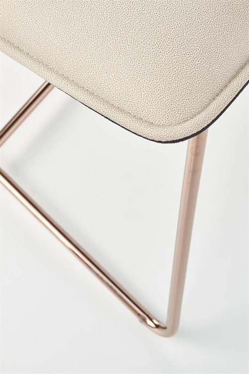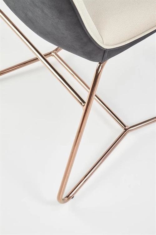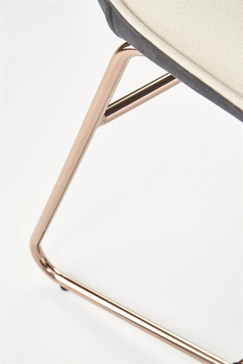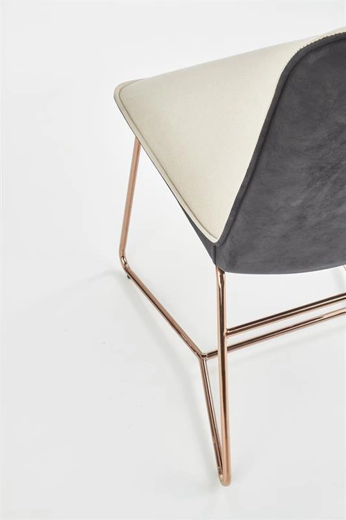 Połączenie dwóch rodzajów wykończenia – miękkiej tkaniny i gładkiej eco skóry – podkreśla wyjątkowy design modelu, a jednocześnie zwiększa trwałość i komfort użytkowania. Ergonomicznie wyprofilowane oparcie zapewnia wygodne wsparcie pleców, a miękkie siedzisko umożliwia długie, komfortowe siedzenie. Stabilna podstawa wykonana ze stali chromowanej w kolorze złotego różu dodaje konstrukcji lekkości i elegancji, zachowując przy tym solidność i wytrzymałość.