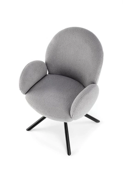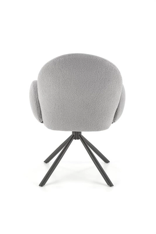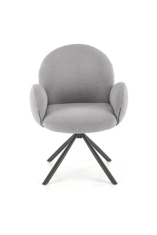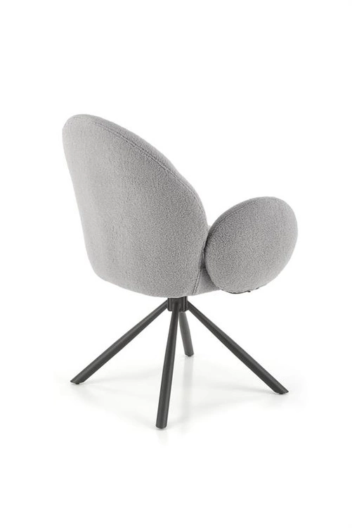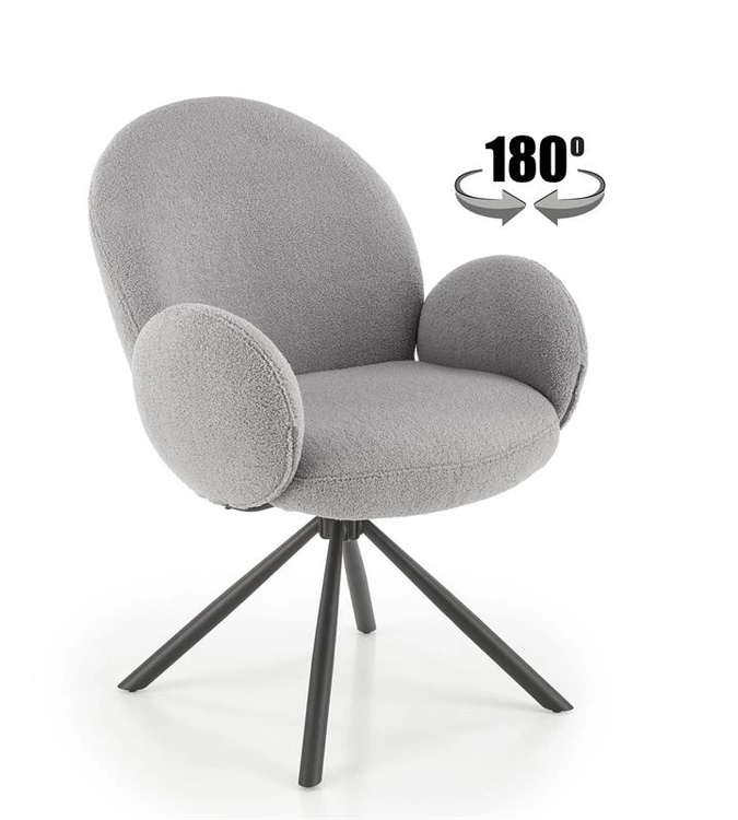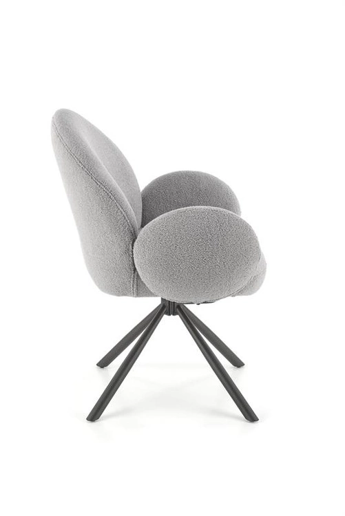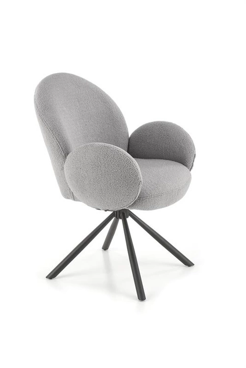 - Krzesło K498 w kolorze popielatym to elegancki mebel z funkcją obracania, wykonany z miękkiej tkaniny boucle. Komfortowe siedzisko i stabilna metalowa podstawa tworzą stylowy akcent w jadalni, salonie lub gabinecie.