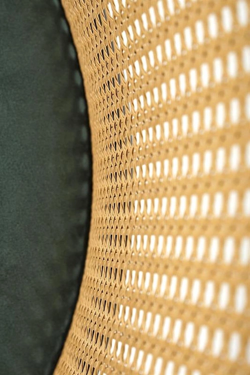 - Krzesło K508 w kolorze ciemnozielonym to wyjątkowe połączenie tkaniny velvet, rattanu syntetycznego i metalowej podstawy. Stylowy design i wysoki komfort sprawiają, że idealnie pasuje do nowoczesnych i naturalnych wnętrz.