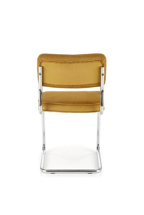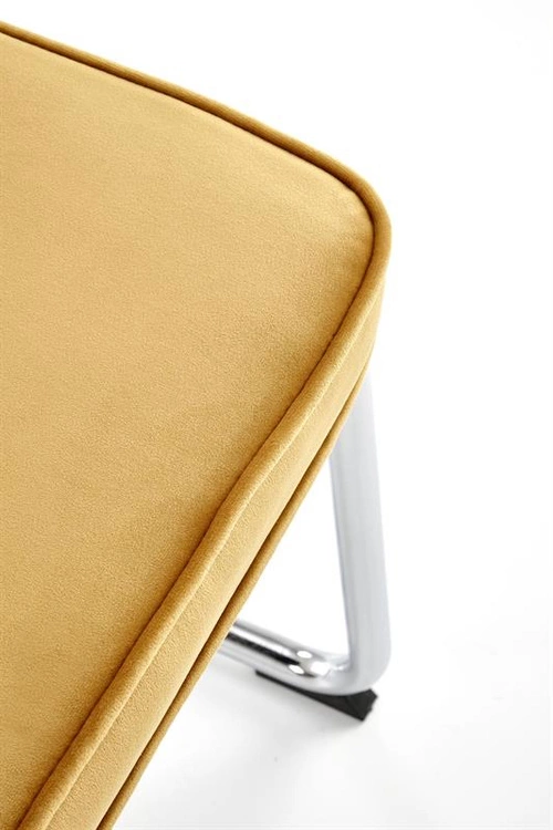 - Krzesło K510 w kolorze musztardowym to połączenie elegancji i wygody. Miękka tkanina velvet i połyskująca chromowana podstawa tworzą nowoczesny mebel idealny do jadalni, salonu lub biura.