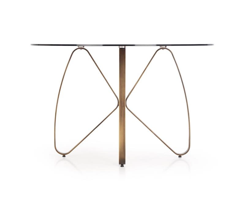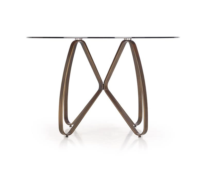 Okrągły stół LUNGO w kolorze złoty antyczny / brązowy to połączenie elegancji, nowoczesnego wzornictwa i szlachetnych materiałów. Blat wykonany z hartowanego szkła w głębokim odcieniu brązu nadaje całości wyjątkowego, ciepłego charakteru, a metalowa podstawa w kolorze antycznego złota wprowadza nutę luksusu i klasycznej elegancji.