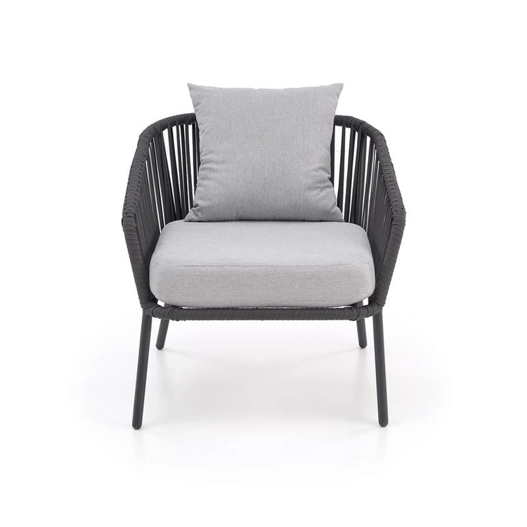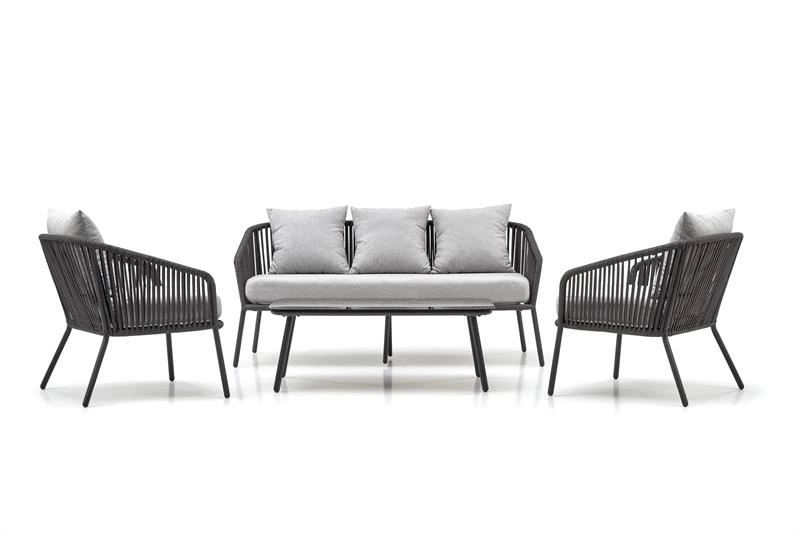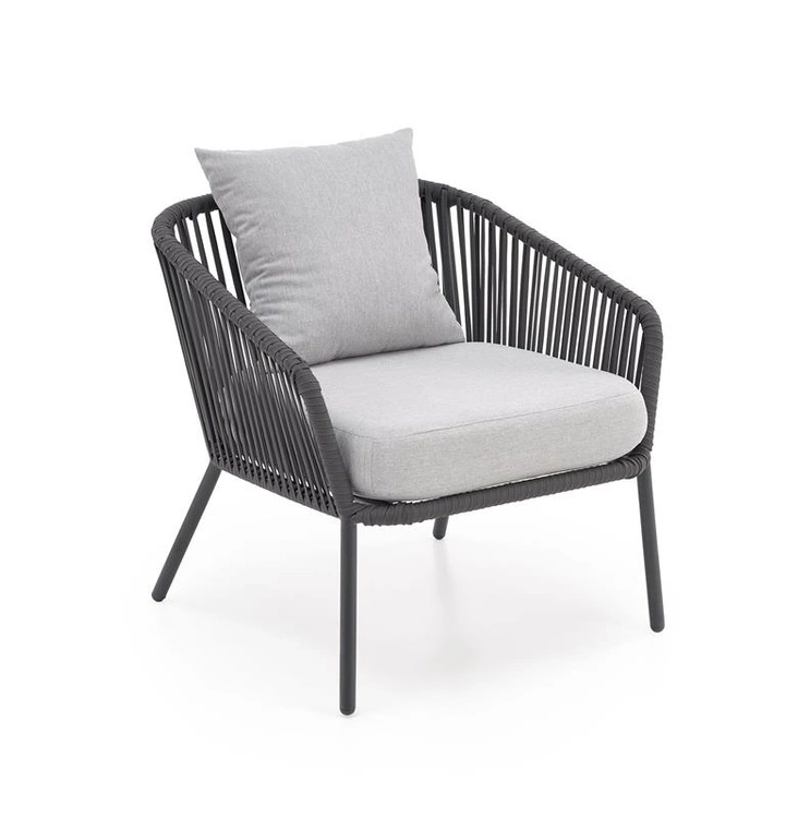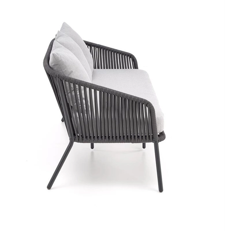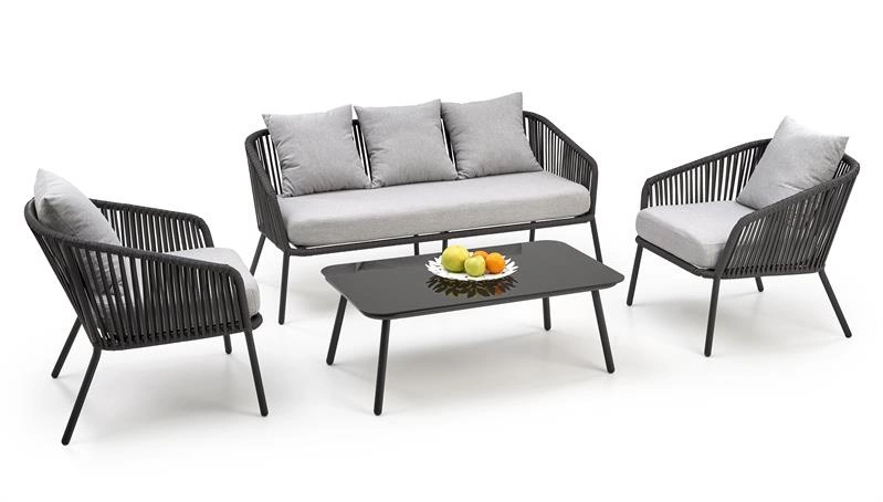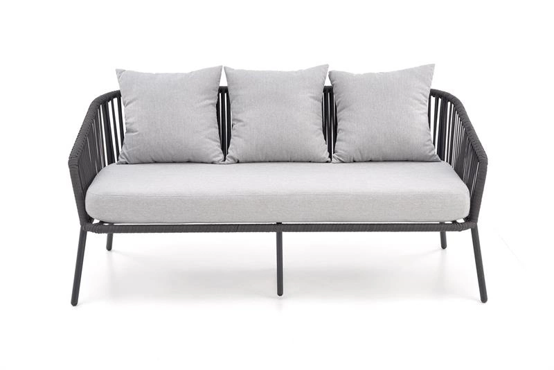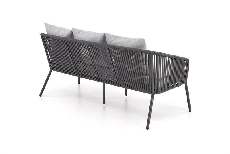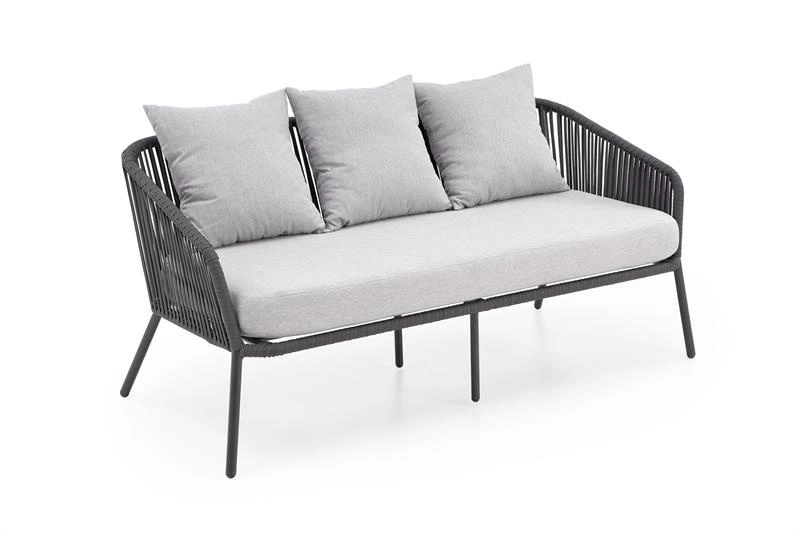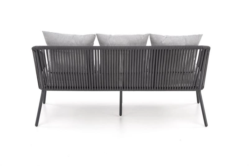 Konstrukcja mebli wykonana została z lekkiego, a zarazem trwałego aluminium malowanego proszkowo, co gwarantuje odporność na warunki atmosferyczne i korozję. Oparcia i boki mebli opleciono nowoczesną linką, która dodaje całości wyjątkowego charakteru i lekkości. Miękkie poduszki w odcieniu jasnego popielu zapewniają wysoki komfort siedzenia, a szklany blat ławy jest łatwy w utrzymaniu czystości.