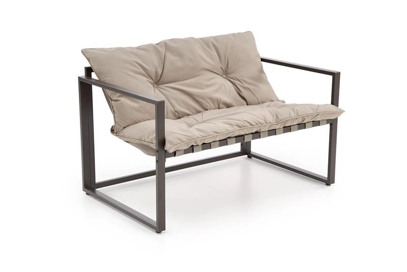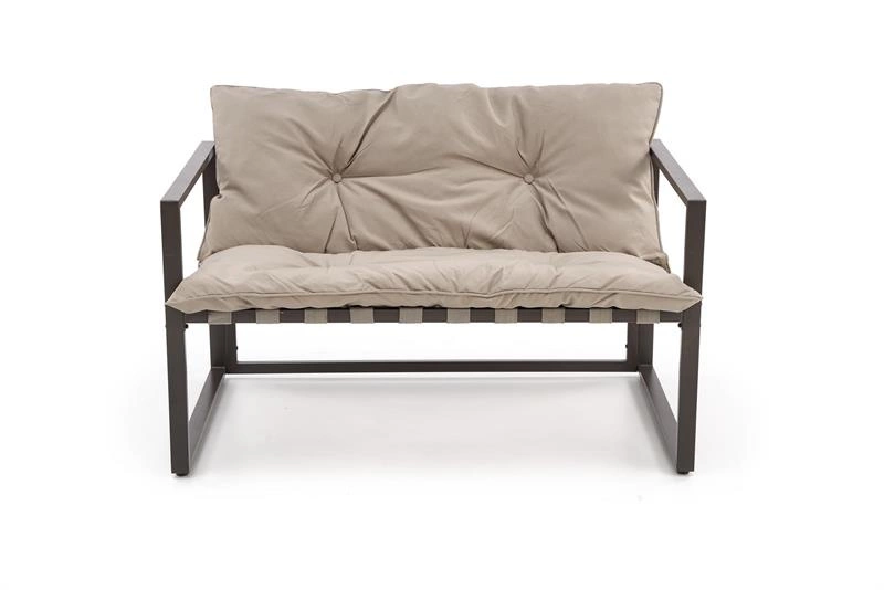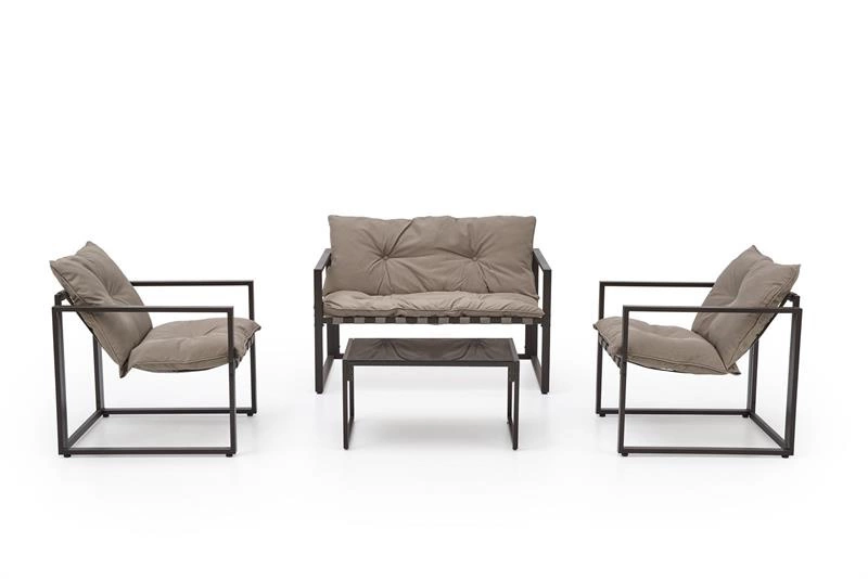 Konstrukcje mebli wykonano ze stali malowanej proszkowo, co zapewnia im trwałość, stabilność i odporność na działanie czynników atmosferycznych. Siedziska i oparcia pokryte są miękkimi poduszkami w odcieniu cappuccino, które idealnie komponują się z ciemnym brązem stelaży, nadając całości przytulny i elegancki wygląd.