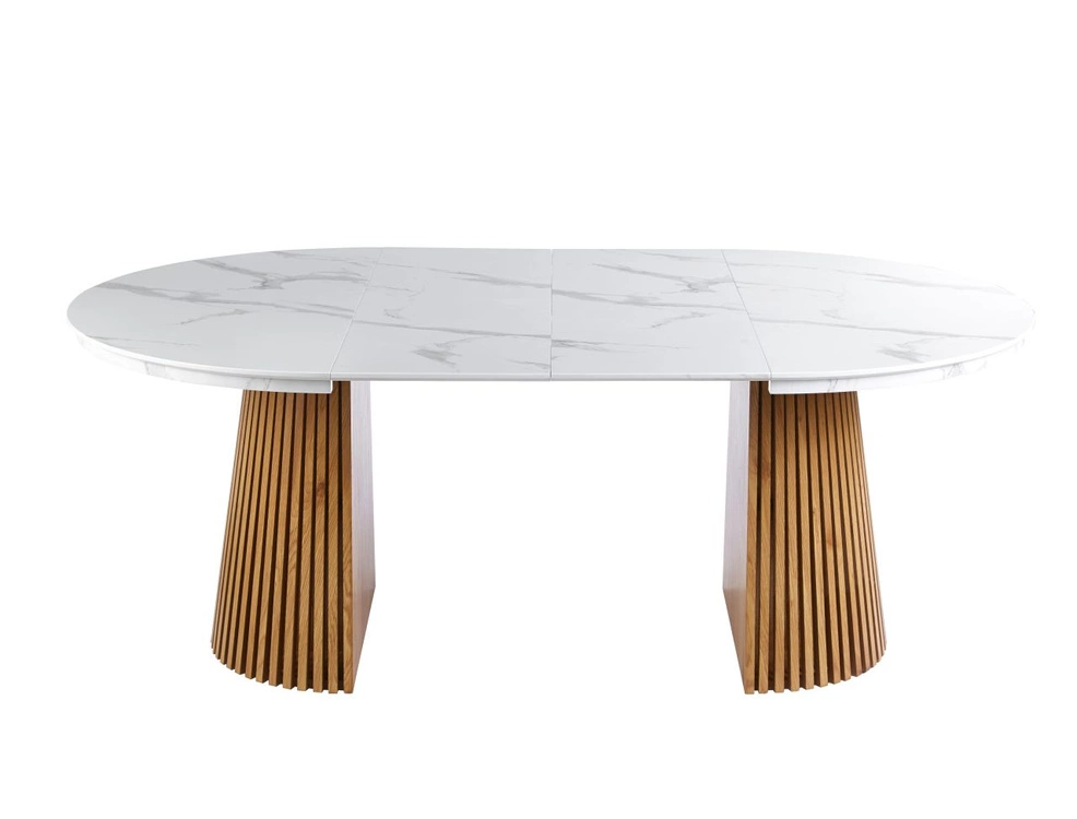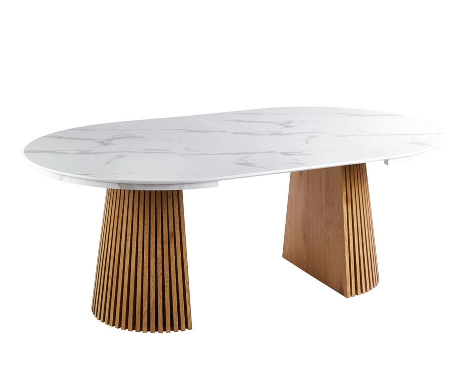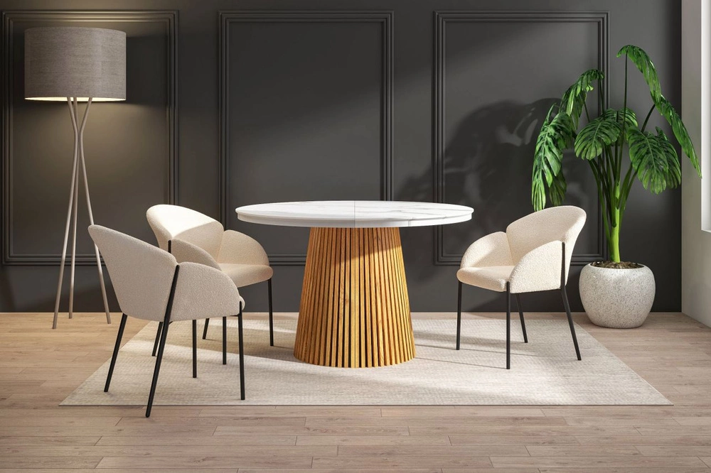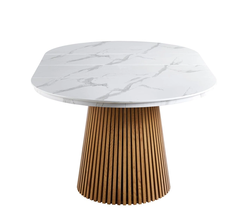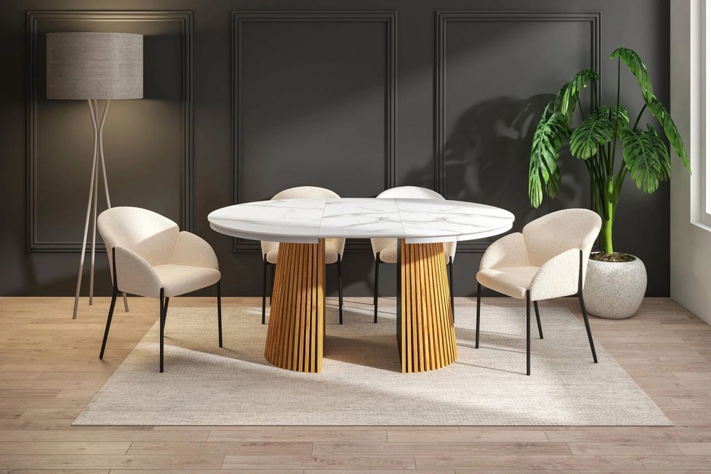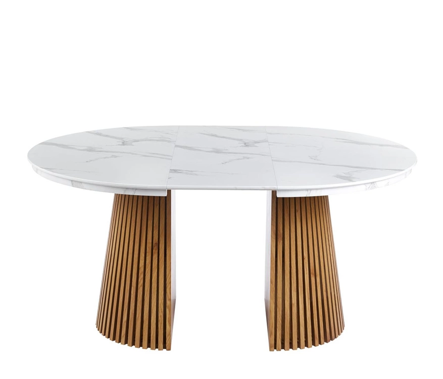 Ten nowoczesny, okrągły stół rozkładany zachwyca połączeniem jasnego blatu w efekcie białego marmuru z ciepłym, naturalnym odcieniem dębowej podstawy. Blat wykonany z MDF pokrytego laminatem dekoracyjnym jest odporny na codzienne użytkowanie i pięknie odbija światło, nadając wnętrzu świeżości oraz elegancji.