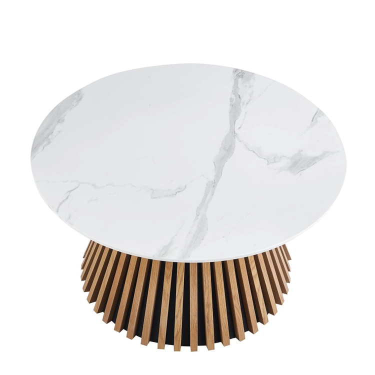 Designerska podstawa z pionowych listew w kolorze dębu stanowi mocny element dekoracyjny i przyciąga wzrok swoją formą. Konstrukcja jest stabilna, a jednocześnie nadaje meblowi lekkości, co czyni go doskonałym uzupełnieniem nowoczesnych aranżacji. Zestawienie marmurowego blatu i naturalnego dębu wprowadza do wnętrza harmonię oraz wyjątkowy styl.