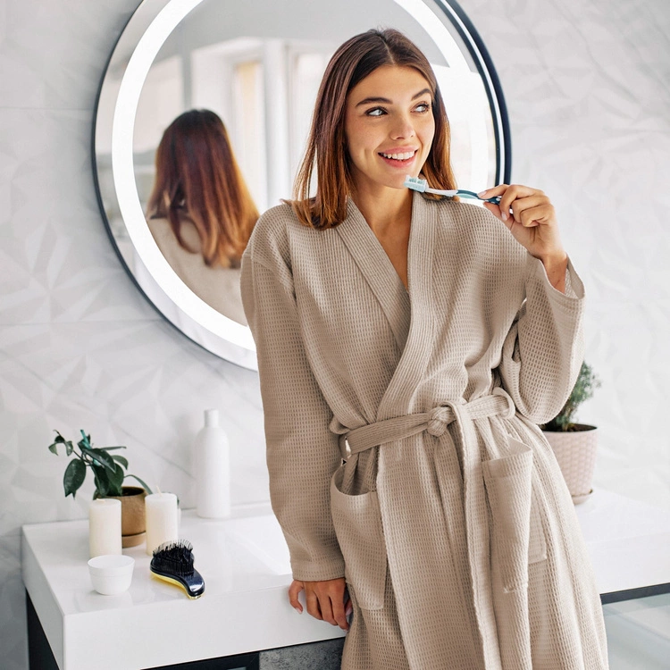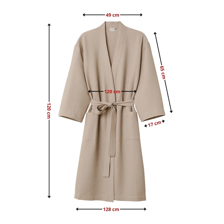 - Elegancki szlafrok unisex w subtelnym beżowym odcieniu, wykonany w 100% z naturalnej bawełny o strukturze waflowej (gofer). Lekki, oddychający i komfortowy – idealny do domu, hotelu czy podróży.