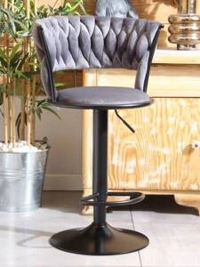 Obrotowy hoker ROSA 1 z regulacją wysokości, z welurowym siedziskiem i plecionym oparciem w kolorze szarym. Srebrny stelaż i noga dodają elegancji. Idealny do nowoczesnych wnętrz, łączy funkcjonalność z luksusowym designem.